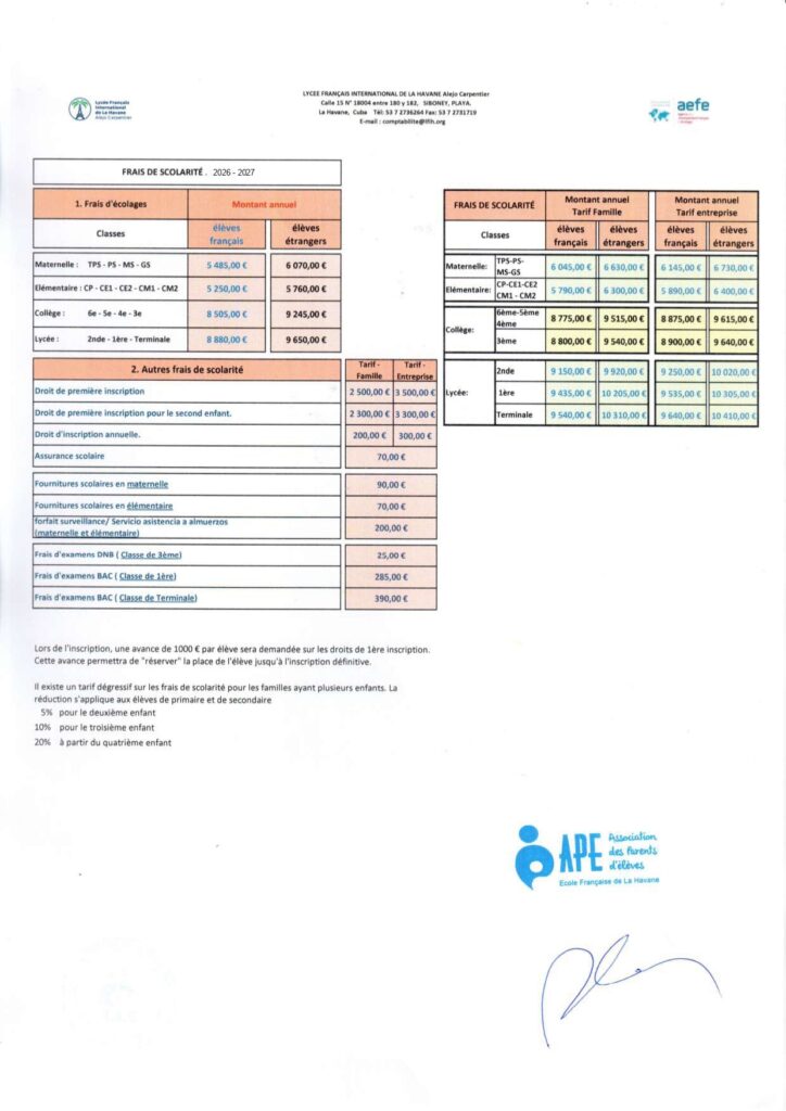 There is a sliding scale of tuition fees for large families. The reduction applies to primary and secondary pupils.